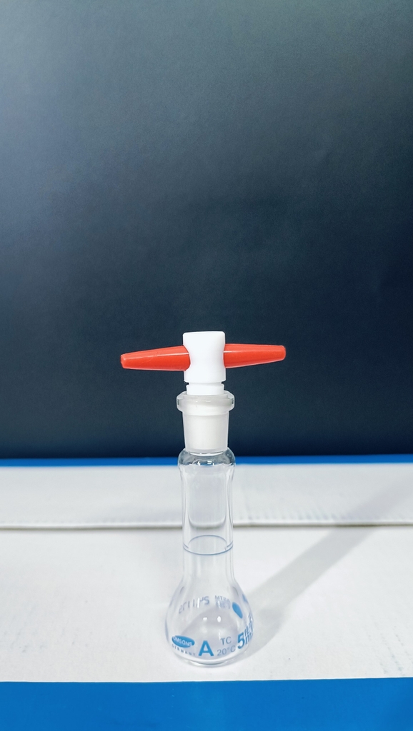 Bình định mức trắng 50ml, khóa nhựa, Class A, Hãng OMSONS GERMANY
