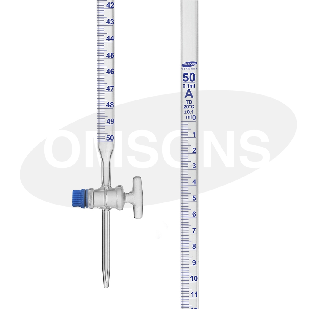 Buret thẳng khóa thủy tinh 50ml, Class B, Hãng OMSONS GERMANY